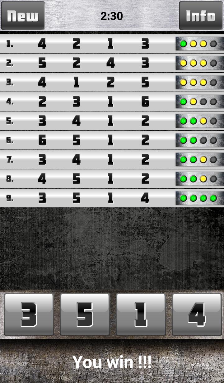 Crack The Code 、有名なクラシックゲームの首謀者の原則に基づいていますが、4桁のコードを色の組み合わせではなく復号化する必要があります。適切な組み合わせだけでなく、4つの数値の正しい配置も重要です。 10以内にクラックするのはそれほど簡単ではないように、コードを試してください。